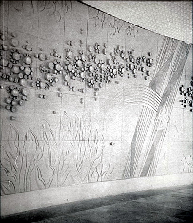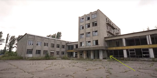 Вот главный вход во Дворец культуры. Стрелкой показано место панно «Утро», которое было выполнено в 1982 году в технике рельефа и контррельефа по гипсу с росписью. Панно в вестибюле хорошо освещалось при дневном, естественном освещении и в вечернее время светильниками, вмонтированными в потолок.