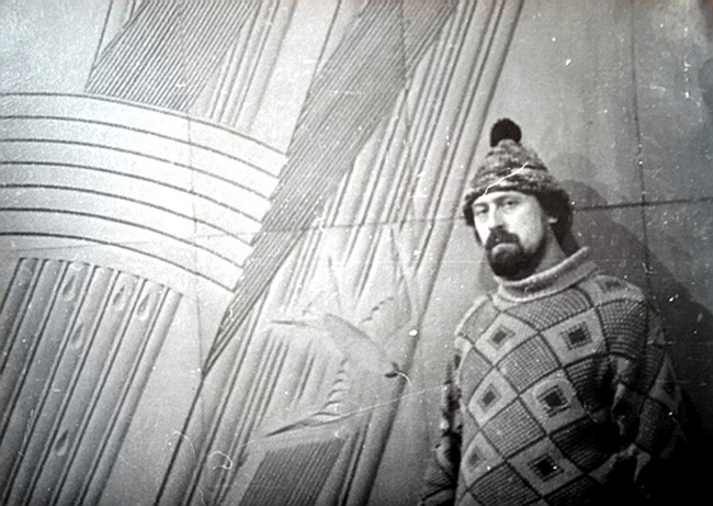 Архивное фото: заслуженный художник РФ Юрий Утенков у готового фрагмента «Дождь и радуга».