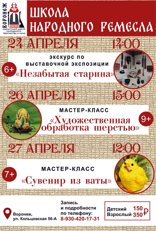 Министерство культуры Воронежской области и Воронежский центр народного творчества и кино пригласили всех желающих на тематические акции и мастер-классы, которые состоятся на этой неделе. Билет стоит 350 рублей. Мероприятия проводятся в рамках «Школы народного ремесла».