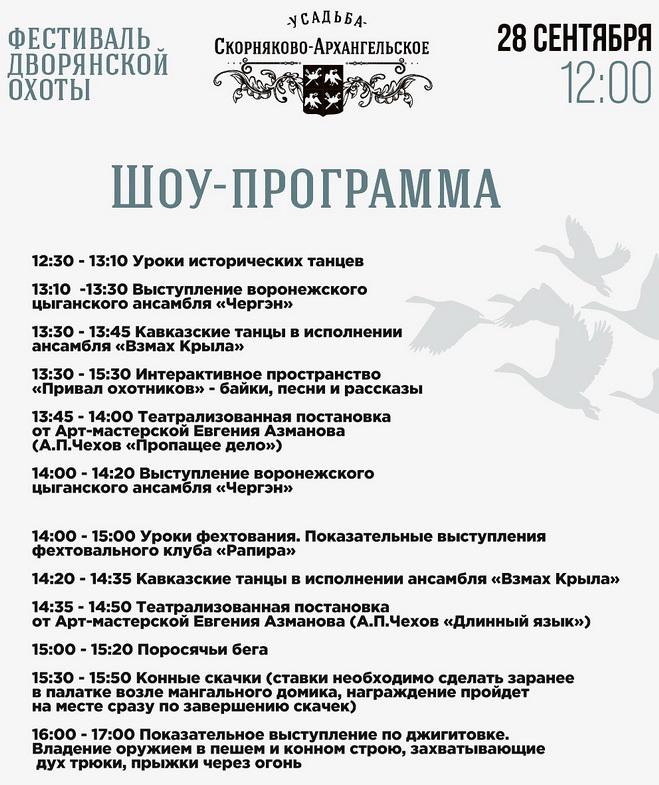 Организаторы пригласили туристов на фестиваль «Дворянская охота», который будет проходить в воскресенье, 28 сентября, в усадьбе Скорняково-Архангельское Липецкой области (Задонский район, село Скорняково). Узнать условия можно по телефону +7 920-536-16-03.