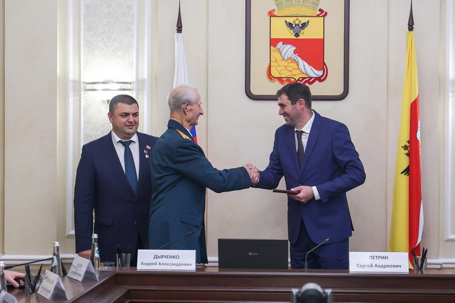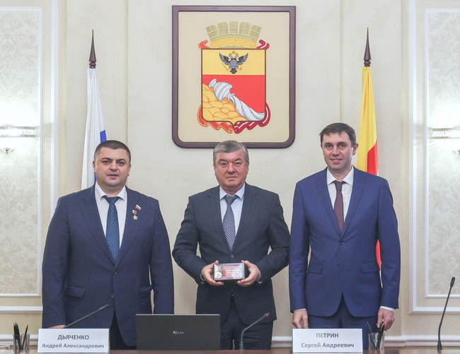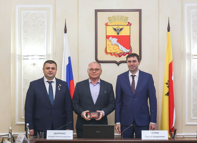 Глава Воронежа Сергей Петрин и председатель городской Думы Андрей Дьяченко вручили сегодня памятные знаки «Воронеж — город воинской славы» троим жителям столицы Черноземья.