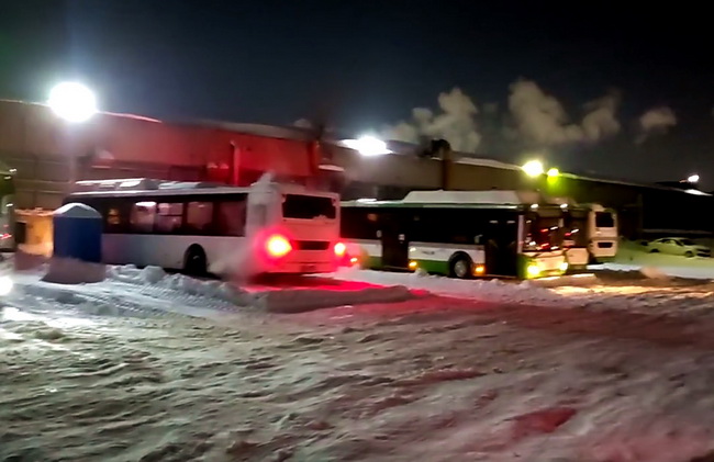 Вот так выглядят сейчас территории автотранспортных предприятий, где всю предстоящую ночь будут прогревать автобусы, чтобы они могли в понедельник выйти на маршруты.