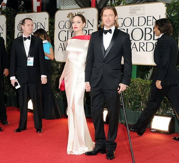Джоли пришла в плотном белом (с небольшим добавлением красного) атласном платье с разрезом на бедре. Рядом с ней мужественно смотрелся Брэд Питт, который все еще передвигается с тросточкой – после неудачного падения пару недель назад.