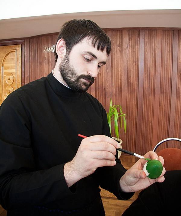 Митрополит Сергий показал пример нерешительным гостям и Пасхальное яйцо при помощи кисти и красок в руках архипастыря покрылось искусным рисунком.