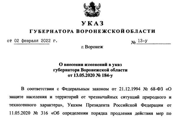 Обнародован указ губернатора Воронежской области № 13-у от 2 февраля 2022 года. Он касается культуры, спорта, образования. Водятся новые ограничительные и запретительные меры в связи с быстрым распространением коронавирусной инфекции, вирусов гриппа и ОРВИ.
