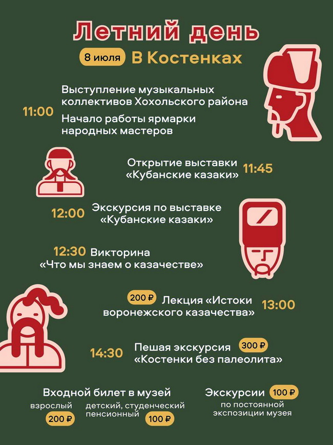 8 июля проводится праздник «Летний день в Костёнках». Запланировано открытие выставки «Кубанские казаки», будет работать ярмарка-выставка народных мастеров, прозвучат казачьи песни в исполнении коллективов Хохольского района.
