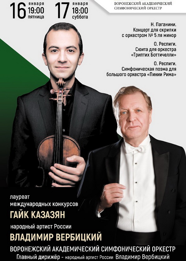 В пятницу и субботу, 16 и 17 января, в Воронежской филармонии выступит лауреат международных конкурсов, талантливый скрипач Гайк Казазян. Вместе с Воронежским академическим симфоническим оркестром музыкант исполнит Концерт для скрипки с оркестром № 5 ля минор Никколо Паганини.