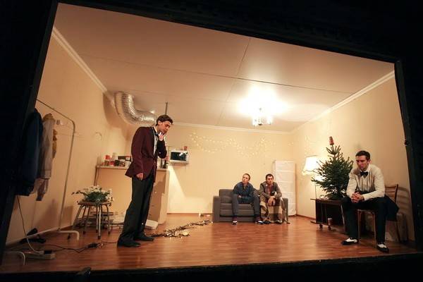 В спектакле Кирилла Вытоптова действие пьесы перенесено в полупустую комнату съемной квартиры. Мировое дерево здесь - осыпавшаяся елка, которую так никто и не убрал после праздника.