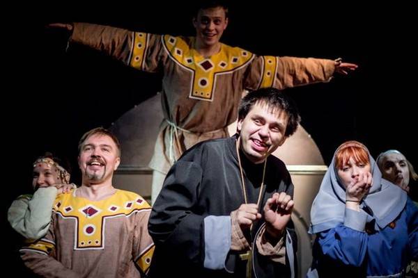 Шестеро членов этой «балаганной» труппы – Олег Столповский, Николай Байбаков, Елена Дахина, Анастасия Ечеина, Алексей Иванов, Мария Малишевская – не только оживляют три разные сказки, но и успевают за час с небольшим переиграть множество ролей. Причем, нередко им приходится представлять не только людей, но и животных. И даже насекомых.