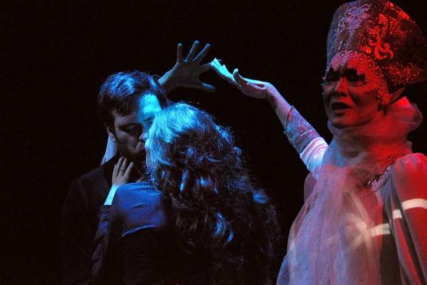 В трёх девушках (Екатерина Марсальская, Алевтина Чернявская, Ирина Сорокина), произносящих текст от автора, легко узнать греческих парок, несмотря на русско-народный наряд. Они плетут нить судьбы, дирижируют происходящим, но и сами переживают вместе с героями все превратности судьбы. Спектакль начинается целым каскадом остроумных аллюзий и фарсовых ситуаций, реплики персонажей обретают второй смысл.