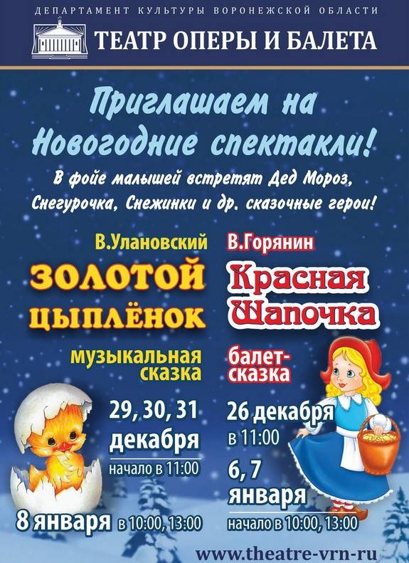 Балет-сказка «Красная Шапочка» на музыку воронежского композитора Владимира Горянина пройдёт 26 декабря 2015 года (начало в 11:00), 6 и 7 января 2016 года (начало в 10:00 и 13:00).