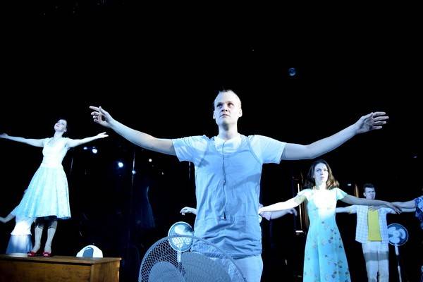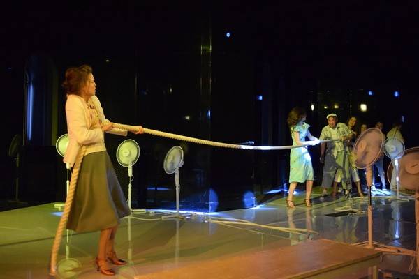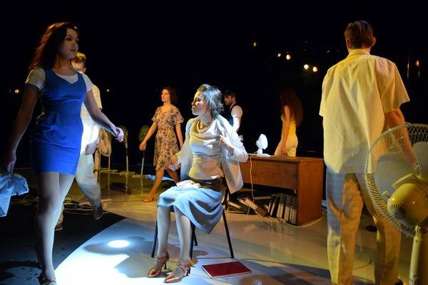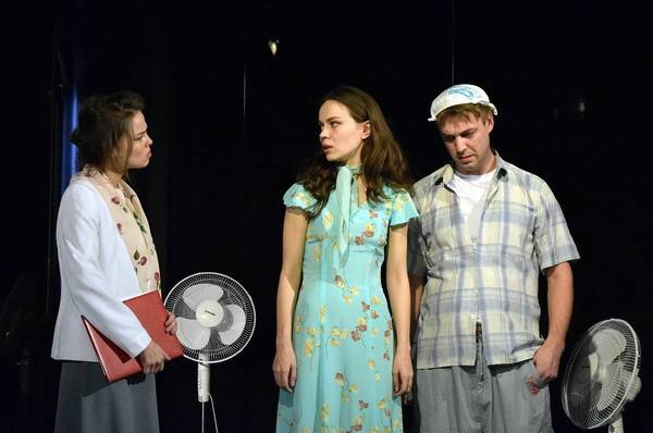 Такой организации пространства и такой конфигурации зрительских мест в Малом зале Воронежского академического театра драмы имени А. Кольцова, пожалуй, ещё не было. Узкая площадка во всю длину зала заставлена напольными вентиляторами. Это главный, мыслеобразующий элемент оформления спектакля Никиты Рака «С любимыми не расставайтесь».