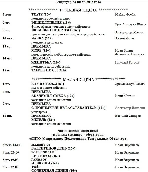 Академический театр драмы имени А. Кольцова единственный в Воронеже работает в июле (за что ему большое спасибо) и ждёт зрителей на своих спектаклях. Советуем перед долгим расставанием с театральным искусством выбрать постановку по вкусу и побывать в уютном старинном здании на Большой Дворянской (проспекте Революции).