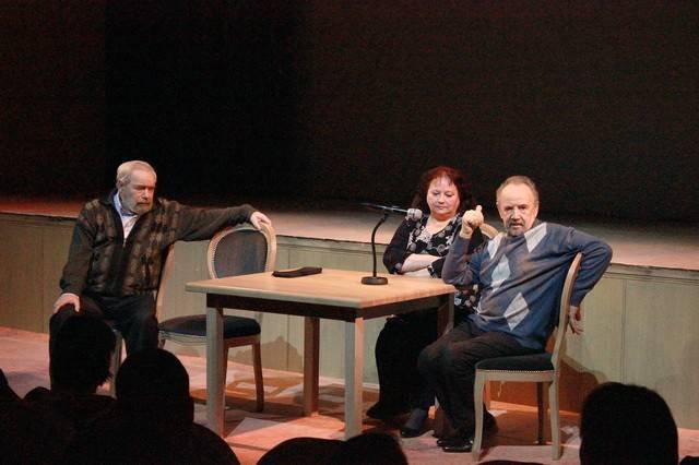 А Валентина Юрова, сыгравшая в спектакле секретаршу, которую председатель заставил снять мини-юбку и надеть длинное платье, растрогалась. Она поблагодарила организаторов проекта за то, что они смогли сделать из снятого спектакля полноценный фильм. Ведущий проекта, нынешний художественный руководитель театра Владимир Петров растрогался в ответ…