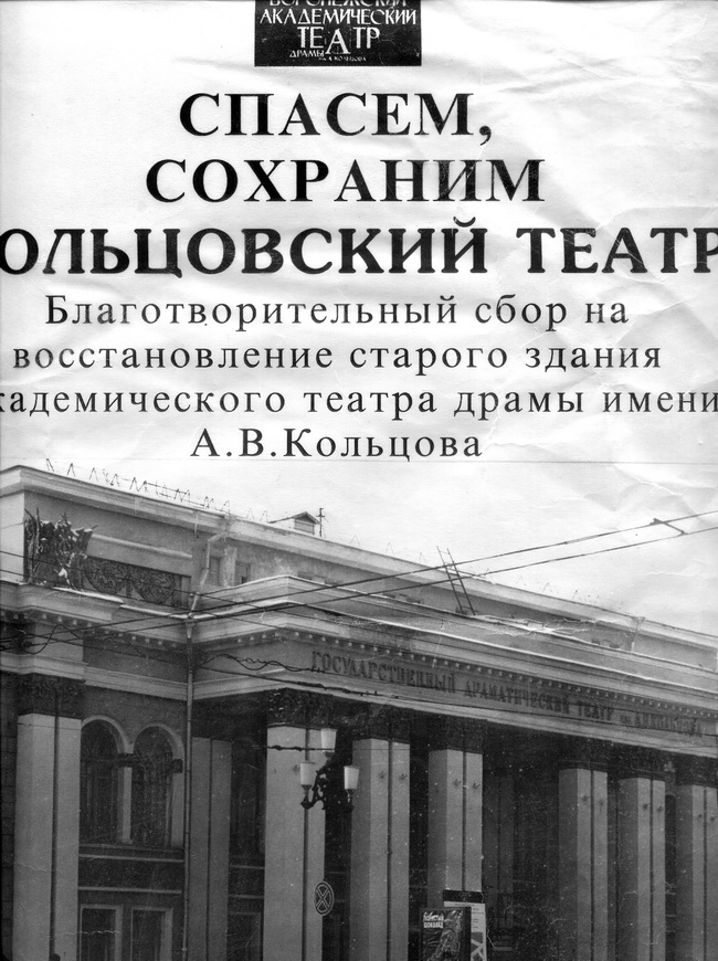 Мы не можем равнодушно видеть, как погибает национальное искусство. Мы опасаемся, что после развала российского кинематографа и книгоиздательства наступит и наш черёд. Разрушить можно в считанные минуты, на восстановление потребуются десятилетия. Работники театра и представители общественности города, сознавая ответственность перед потомками, понимая, что в нынешних условиях государство не в состоянии в полной мере нам помогать, учредили общественный фонд спасения театрального искусства «Кольцовский театр».