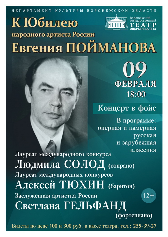 Накануне юбилея Евгения Пойманова, 9 февраля, на малой сцене в театральном фойе состоится посвящённый ему концерт ведущих солистов Воронежского театра, лауреатов международных конкурсов Людмилы Солод и Алексея Тюхина. В концерте примет участие заслуженная артистка России Светлана Гельфанд (фортепиано). Прозвучат произведения русской и зарубежной оперной и камерной классики. А благодаря мультимедийным технологиям на экране будут показаны архивные записи выступлений самого Евгения Пойманова. Начало в 18:00.