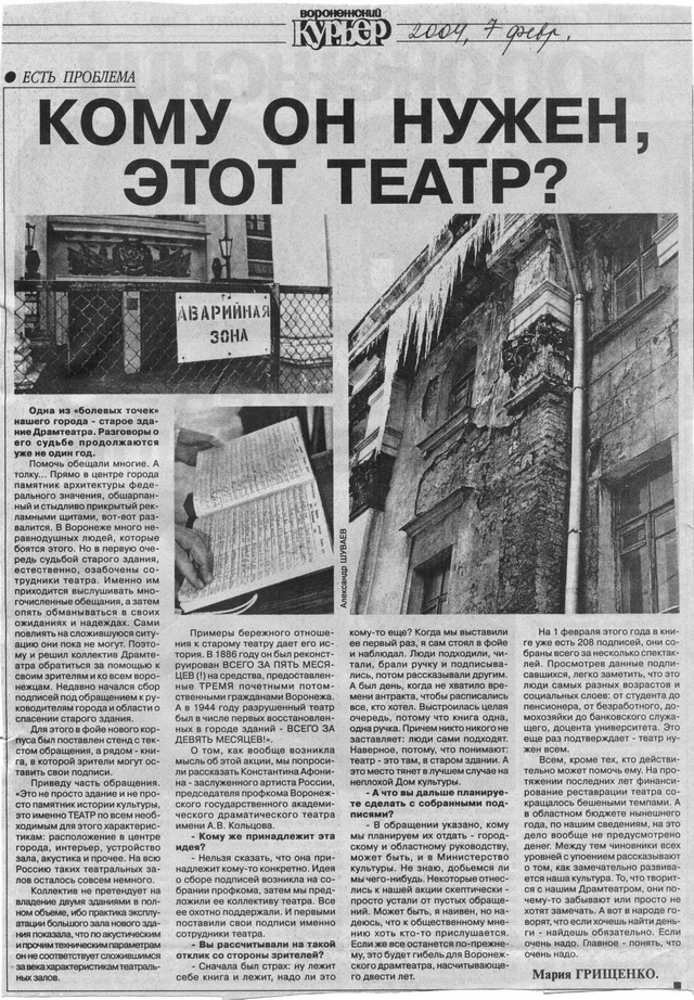 К декабрю 2001 года и воронежская и центральная пресса уже более 50 раз обращались к теме спасения старого здания (эти факты задокументированы мною как завлитом), которое к этому времени, в самом сердце города покрытое грязно-зелёным саваном, всё более разрушалось на глазах у жителей и его гостей.