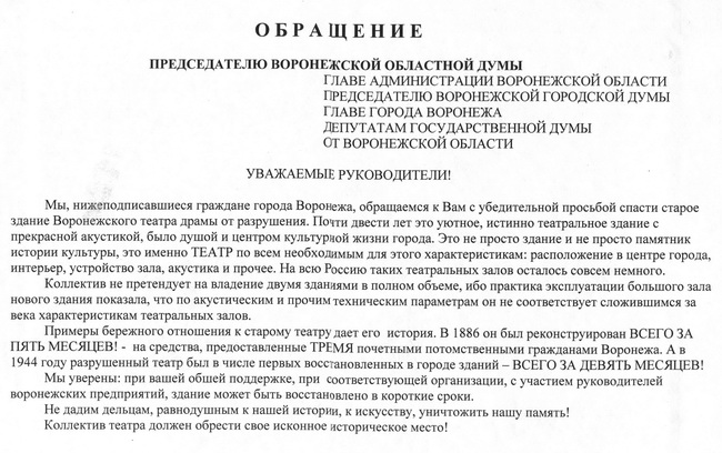 Хочу обнародовать, пока живы действующие лица и свидетели, один общественно значимый эпизод пятнадцатилетней давности, имеющий прямое отношение к воронежской культуре, а если точнее, – к искусству, к театру. Нашему старейшему, драматическому.