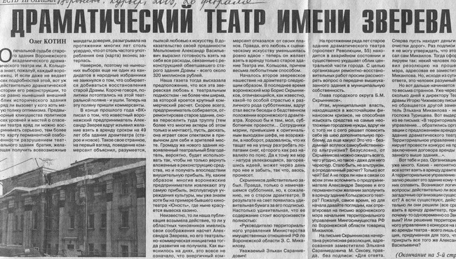 Наступил 2005 год. И вот, – сюрприз! 26 февраля газета «Воронежский курьер» на первой странице публикует развёрнутый материал под заголовком «Драматический театр имени Зверева». В нём речь о том, что известный предприниматель готов взять здание в аренду всего-навсего на… 49 лет! Чтобы было понятно сегодняшнему читателю, приведу лишь одну цитату из обращения заместителя руководителя Территориального управления Федерального агентства по управлению федеральным имуществом по Воронежской области директору театра драмы Игорю Михайловичу Чижмакову: «В Территориальное управление… обратились организации с предложением арендовать здание Драматического театра… Территориальное управление планирует провести конкурс на право заключения договора аренды указанного выше здания…».