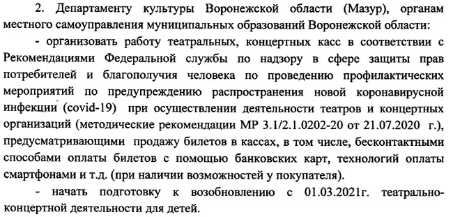 Департаменту культуры области также надлежит организовать работу театральных и концертных касс в соответствии с рекомендациями специалистов Роспотребнадзора. Разрешается оплата наличными, а также с помощью банковских карт и смартфонов.