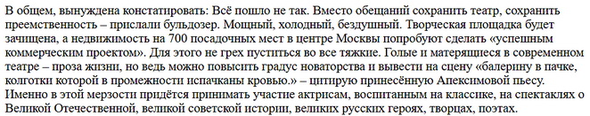 Она сообщила, что по решению нового руководства снят с репертуара спектакль «Нечистая сила», который пользовался огромной популярностью. Другим спектаклям, поставленным Губенко, тоже жить осталось недолго. Они не нужны «прогрессивным театральным деятелям».