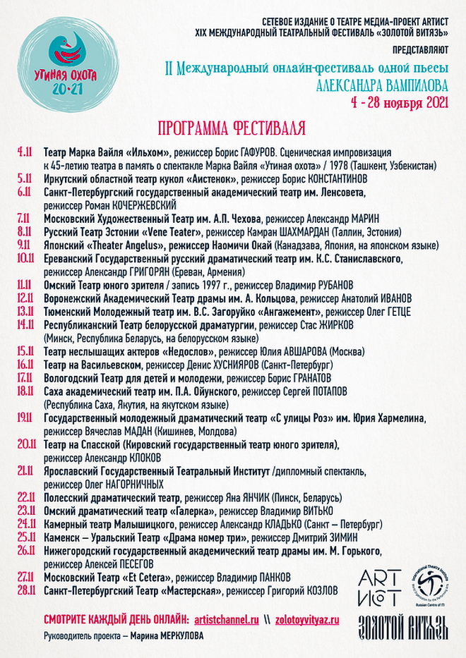Международный онлайн-фестиваль одной пьесы Александра Вампилова «Утиная охота 20.21» проходит с 4 по 28 ноября 2021 года. Спектакли можно смотреть на сайтах Медиа-проекта АRTИСТ www.artistchannel.ru и Международного Театрального фестиваля «Золотой Витязь» www.zolotoyvityaz.ru, а также на YouTube-каналах и страницах социальных сетей данных проектов.