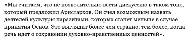 «Мы озабочены тем, что В.В. Аристархову поручено заниматься разработкой важнейшего документа, появление которого может изменить всю картину культурной жизни страны. До настоящего времени отечественная культура развивалась, и мы надеемся, что так будет происходить и дальше, в соответствии с «Основами государственной культурной политики», действующими с 2014 года по Указу Президента РФ В.В. Путина».