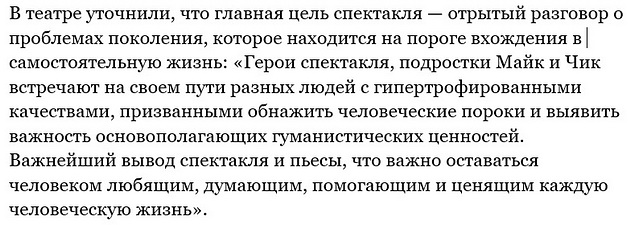 Женщина сочла, что данный спектакль – «вредительство для психики и ценностного фундамента подрастающего поколения». Она намерена подать заявление в прокуратуру, чтобы та проверила театр.