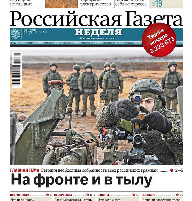 Это выпуск издания «Российская газета. Неделя» № 243 от 26 октября 2022 года. На второй полосе там фото визита Президента РФ Владимира Путина в войска. Уничтожать такую газету на глазах у юных зрителей – это, знаете ли….