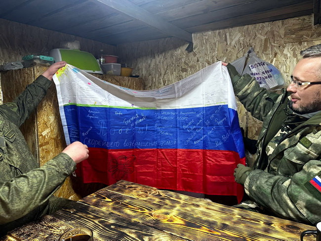 Кроме того, Андрей Александрович передал бойцам на передовой флаг России с пожеланиями от юных зрителей ТЮЗа.