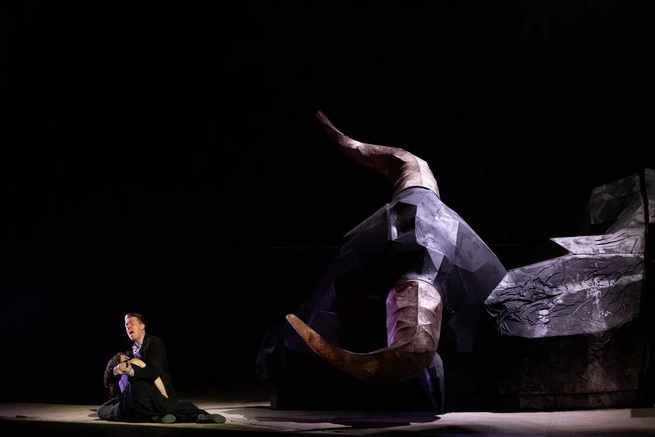 Последним штрихом, призванным отвлечь от трагической развязки истории, становится циклопическая туша быка, появляющаяся на авансцене благодаря поворотному кругу. Вот, оказывается, что в спектакле главное! Актуализация повестки дня – поддержка движения Animal rights movement.