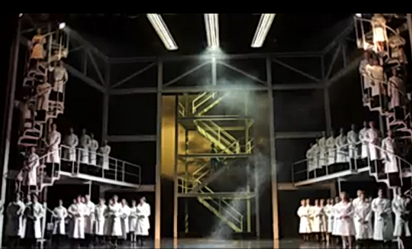Артисты хора и миманс одеты в белые халаты, вооружены блокнотами и ручками. Весь в белом и Мефистофель (впечатляющая работа немецкого баса Рене Папе). Маргарита (Марина Поплавская) выходит в мешковатом синем платье и в кожаных ботинках. В финале она коротко острижена. Фауст (харизматичный немецкий тенор Йонас Кауфман) трудится в лаборатории. В один прекрасный момент, пропав в облаке дыма, он появляется в таком же светлом костюме, как и Мефистофель.