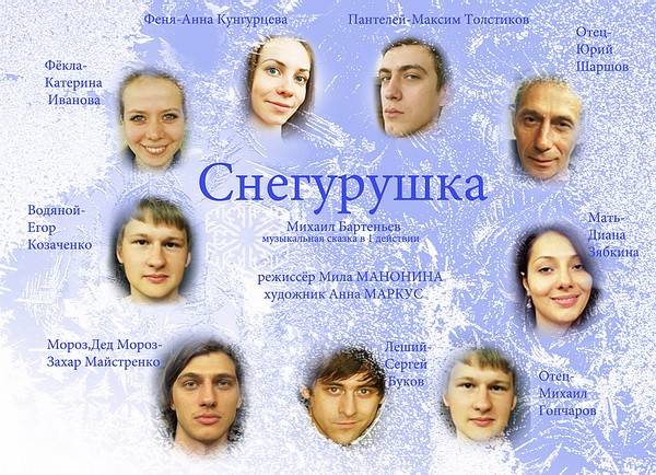В Воронежском академическом театре драмы имени А.В. Кольцова для детей к Новому году ставится сказка «Снегурушка» современного автора Михаила Бартенева. Она создана по мотивам русских народных рождественских сказок, поэтому в ней уживаются и Мороз, и Баба Яга, и Леший, и Водяной. И, конечно же, две девицы – Феня и Фекла, - которые соперничают между собой. И хотя по ходу действия случаются всякие неприятности, все заканчивается хорошо.