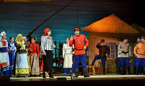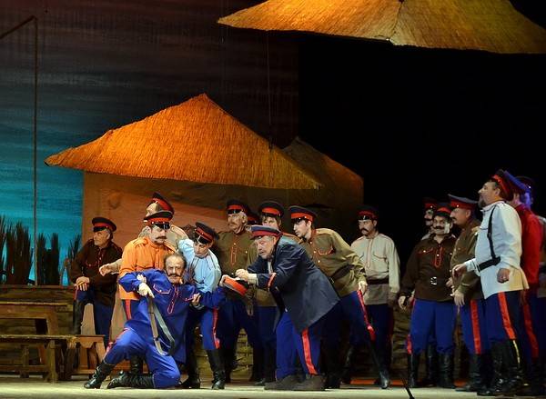 Быт забыт. С самой первой сцены он живописуется скупыми штрихами и весьма скупо обозначается ритуальными действиями. В этом спектакле все приподнято до откровенно театрального. Таких костюмов у реальных казаков не найдется даже для самых больших праздников. На сцене все так ярко и сочно, словно художник-постановщик А. Михальчев и художник по костюмам И. Елистратова решили показать все богатство красочной палитры. И весь первый акт визуальная стихия превалирует над концептуальной. Похоже на долгую экспозицию, которая почти незаметно переходит в завязку.