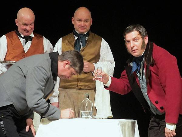 В роли Чичикова – Александр Сидоренко (справа). В спектакле заняты: Сергей Смирнов, Михаил Кривов, Сергей Барашов и другие.