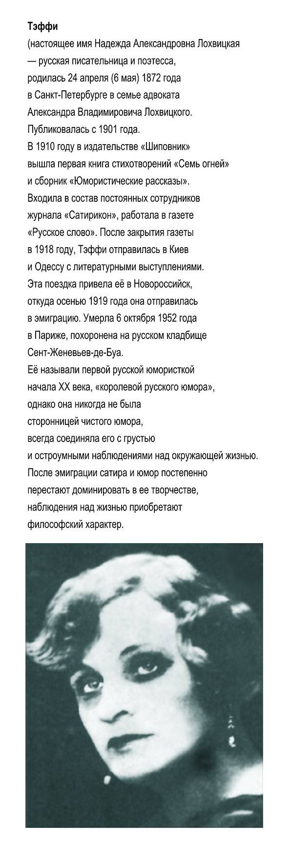 Строки Тэффи оживают буквально: они плывут по сцене, возникая из тьмы небытия и уходя в черноту вечности. Но на какое-то время дух Тэффи определенно появляется в зале – затаившем дыхание, внимающем актрисе. А она на наших глазах проживает целую жизнь, представ поначалу шестилетней девочкой, а в финале – мудрой, зрелой женщиной, но при этом еще более беззащитной перед игрой стихий, чем ребенок из рассказа «Счастливая».