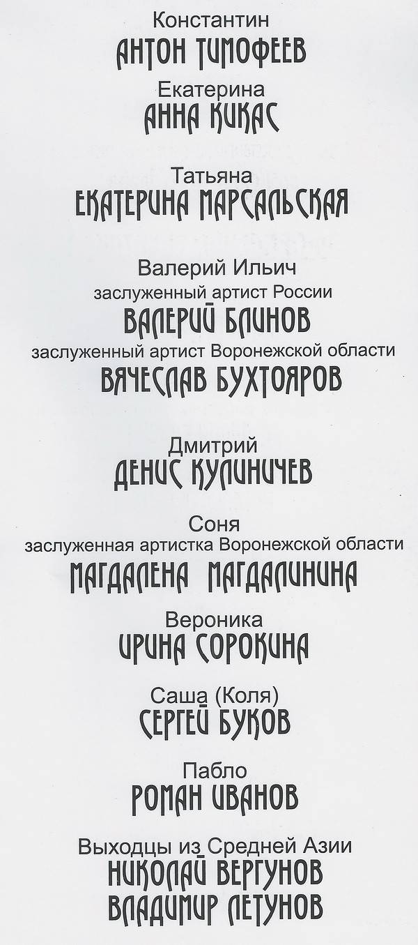 Спектакль не плох. И это, скорее, удача молодого режиссера. Грамотное мизансценирование, лаконичная, но выразительная сценография (Михаил Викторов), неплохие (а некоторые даже хорошие) актерские работы, но… не складывается. И потому еще, что центральный персонаж – Константин – напоминает облако в штанах. Да, он и в пьесе ищет себя, свое место в окружающей его густопсово мерзкой среде. Но в воронежском спектакле одаренный молодой артист Антон Тимофеев при огромной физической отдаче, не понимает, кого и зачем он играет. За всеми его метаниями не просматривается background. Герой умозрителен, абстрактен, а стало быть, неинтересен.