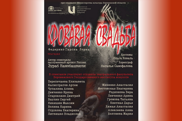 6 и 7 апреля на сцене Дома Актёра состоится премьерный показ спектакля «Кровавая свадьба» по пьесе Федерико Гарсии Лорки. Спектакль является продолжением совместного проекта Воронежского отделения СТД РФ и Воронежского государственного института искусств, который реализуется при финансовой поддержке министерства культуры Воронежской области.