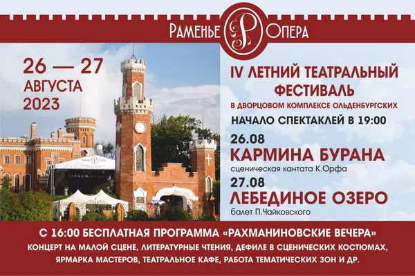 Воронежский театр оперы и балета пригласил публику на IV Летний театральный фестиваль «Раменье-Опера». Он состоится в последние выходные дни лета, 26 и 27 августа. Фестивальные показы спектаклей будут проходить на открытом воздухе в парке Дворцового комплекса Ольденбургских.
