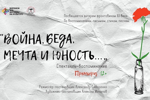 6 мая в 14:00 и 18:00 Воронежский театр юного зрителя представит премьеру – на Малой сцене будет показан спектакль Александра Сидоренко «Война, беда, мечта и юность…». Работы этого режиссёра зачастую становятся событиями культурной жизни города и региона.