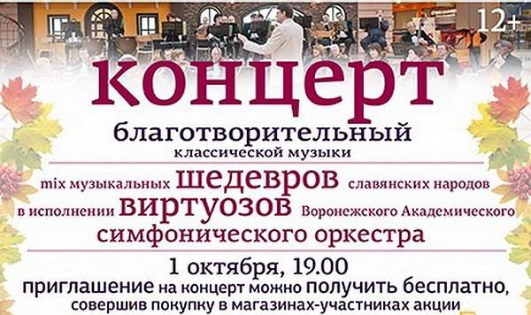 С октября в Центре Галереи Чижова начинается осенняя серия концертов классической музыки. Первое выступление, приуроченное к Международному дню музыки, состоится 1 октября в 19.00. На сцене ресторанного дворика Центра Галереи Чижова прозвучат музыкальные шедевры славянских народов в исполнении Воронежского Академического симфонического оркестра. В этот день каждый сможет внести свой вклад и совершить доброе дело - помочь Веронике Юровой, которая сегодня как никто нуждается в поддержке.