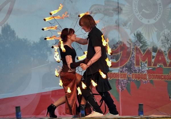 В четвертый раз 9 мая в Воронеже, на Адмиралтейской площади проводился Международный фестиваль огненных искусств «Огни Победы». Шоу неизменно привлекает многотысячную аудиторию и проходит с большим успехом.