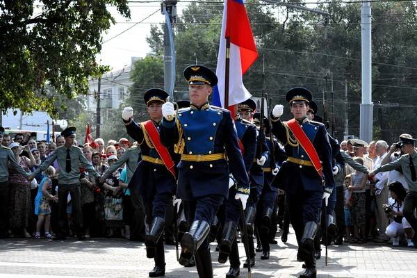 Завершилась церемония открытия памятника «Воронежцам воинам-интернационалистам - участникам локальных войн и военных конфликтов» возложением цветов и венков к подножию мемориала, после чего рота почетного караула прошла торжественным маршем.