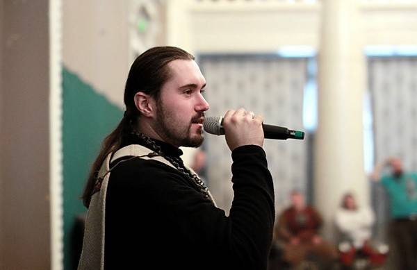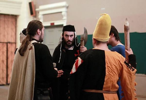 По окончании первого этапа турнира объявили получасовой перерыв. Многие рыцари вышли на улицу, чтобы прийти в себя, подышав холодным осенним воздухом, я пошла вместе с ними. Там случайно познакомилась еще с одним участником мероприятия – Михаилом Радиным. Он приехал на маневры, чтобы поучаствовать в бугуртах – массовых состязаниях рыцарей (выглядит это, как «стенка на стенку»). Он поделился со мной, что еще с детства любил драться на мечах, и с помощью клуба реконструкторов это удовольствие удалось продлить и развить. Также рассказал, что когда проходят Всероссийские открытые реконструкторские фестивали, конечно, больше можно погрузиться в антураж средневековой культуры. Люди живут в шатрах, питаются исключительно из исторической посуды, танцуют под живую музыку волынок, бубнов, барабанов.