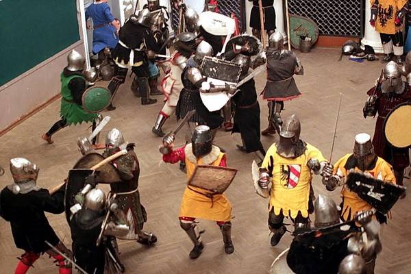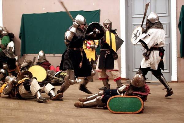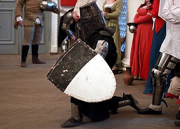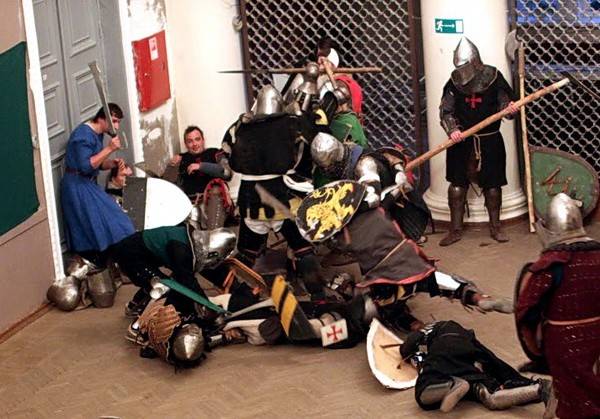 Сначала казалось, что их сражение достаточно безопасное и не такое уж сложное. Но когда судьи объявляли конец боя, ребята просто валились обессиленные на пол. К каждому из них подбегала одна из девушек в средневековом длинном платье с глиняным кувшином в руках. Она помогала им снять тяжелый рыцарский шлем и поила героев водой. Внушительное обмундирование воинов хорошо защищало, но некоторые ребята все же получили пару ушибов во время поединков.