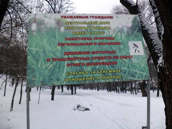 Управление экологии городского округа город Воронеж предупреждает жителей города, что Центральный парк культуры и отдыха является памятником природы областного значения, в связи с чем по его территории строго запрещен проезд автотранспорта, кроме задействованного в процессе по его содержанию и реконструкции.