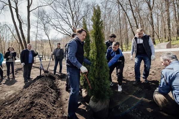 Перед началом акции губернатор ознакомился с ходом работ по реконструкции парка. В данное время рабочие завершают обустройство входной группы – ворот и прилегающей к ним территории. Эти работы планируется закончить к 1 мая. Следующим этапом станет обустройство парковочной зоны на 123 авто перед входной группой.
