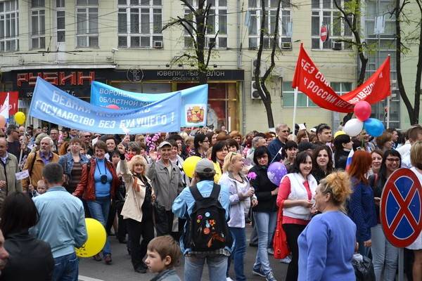 Зато на другом конце проспекта Революции в этот же час было довольно многолюдно. Здесь формировалась колонна трудящихся, чтобы проследовать по главной улице города, манифестируя свою солидарность. И она двинулась в путь – тысячеголовая, во главе с губернатором, председателем облдумы, депутатами Федерального собрания РФ и мэром Воронежа.