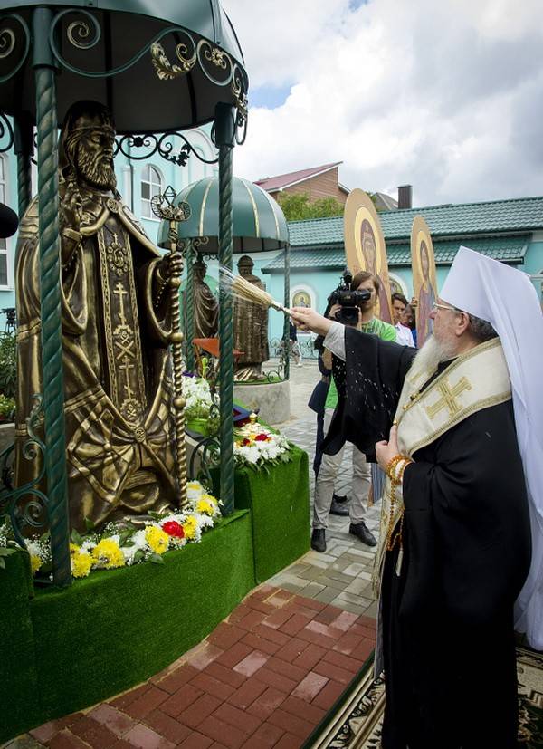 Как сообщает пресс-служба митрополии, по окончании богослужения и проповеди митрополит Сергий вместе с духовенством спустился во внутренний двор храма, где при стечении множества прихожан совершил освящение нового памятника святителю Митрофану.