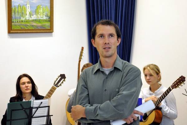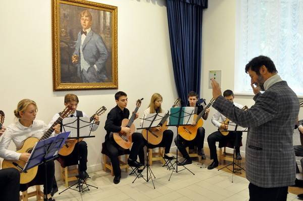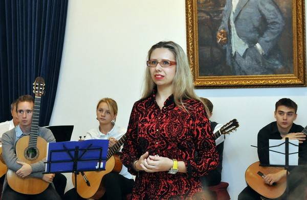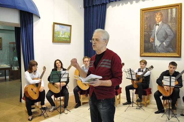 Завершилась первая часть юбилейного вечера выступлением гитарного оркестра «Большое барре» под управлением Сергея Корденко. Особенно проникновенно в исполнении этого известного коллектива прозвучали вариации на есенинские темы.
